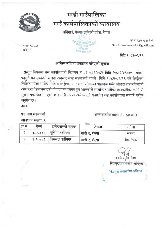 लिखित परीक्षाको नतिजा प्रकाशन गरिएको बारे