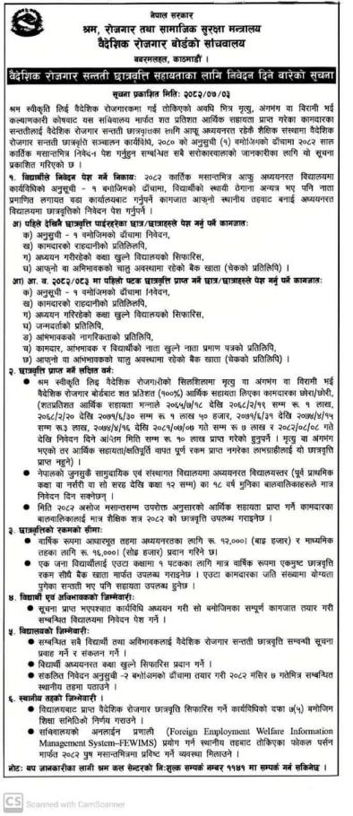 वैदेशिक रोजगार सन्तती छात्रावृत्ति सहायताको लागि निवेदन दिने सम्बन्धी सूचना